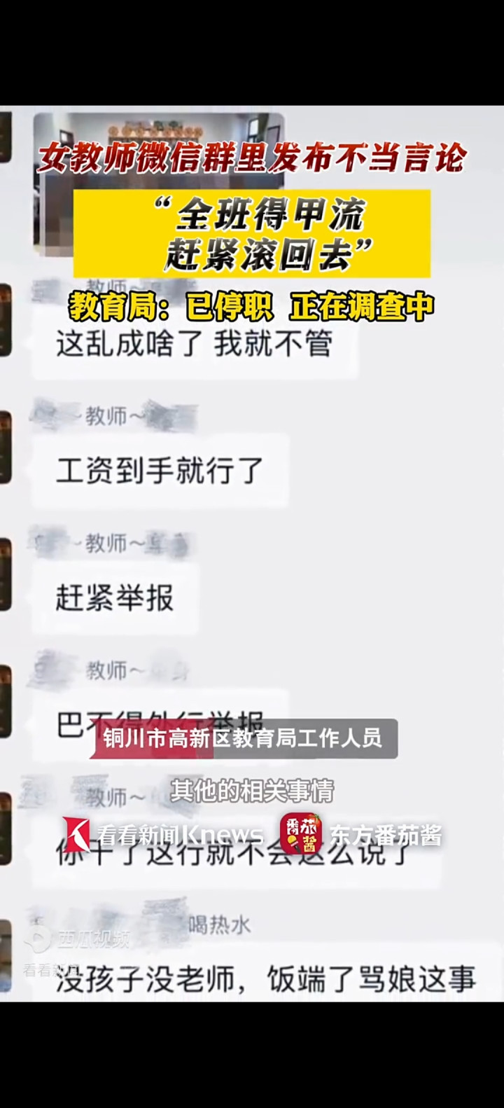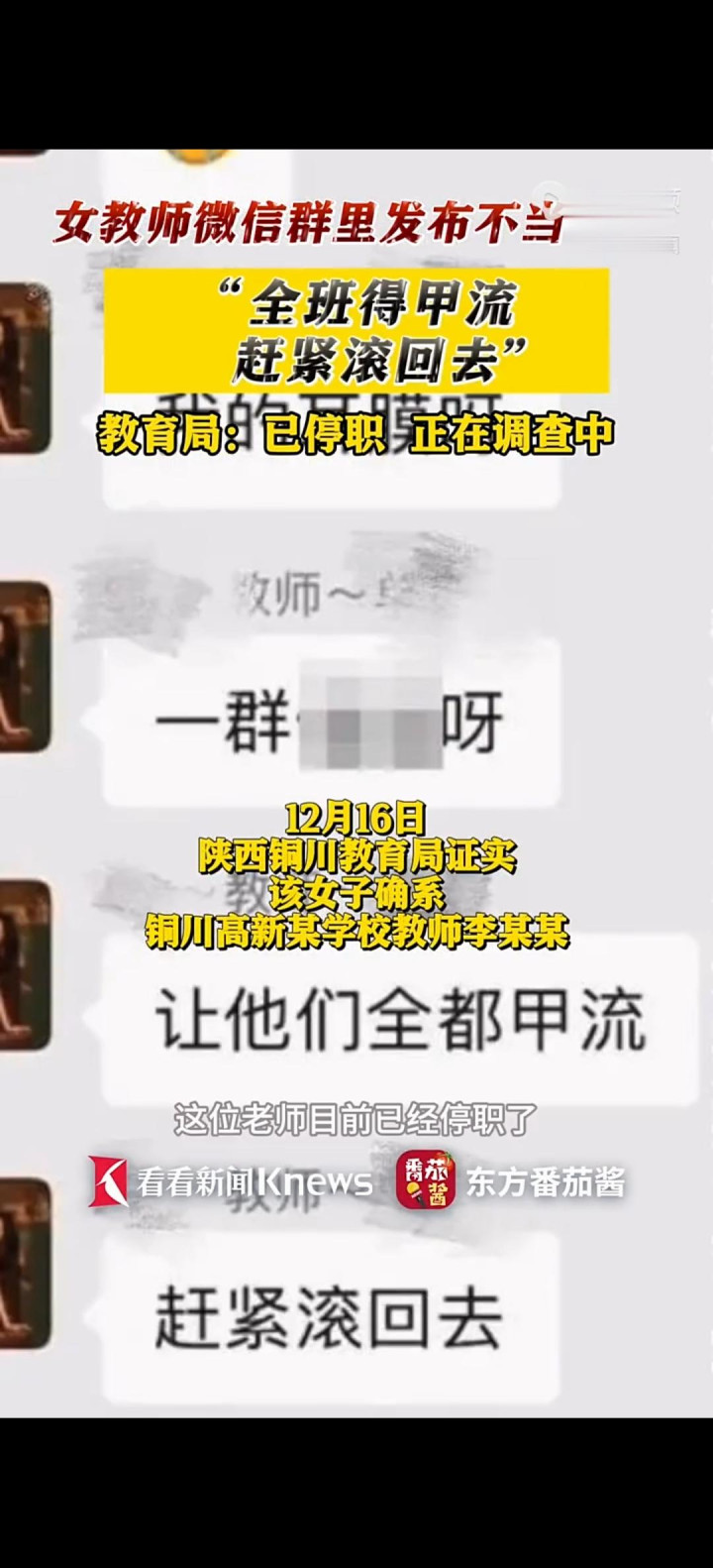 最近网鼎哄传一个聊天截图,陕西铜川一女教师在班级群里活气,说了"全班得甲流""马上滚且归"这种话。发截图的是学生家长,时候裸露是12月16号前。锻练局很快回复,阐述这东说念主是高新某学校姓李的浑朴,并通知停职访问。